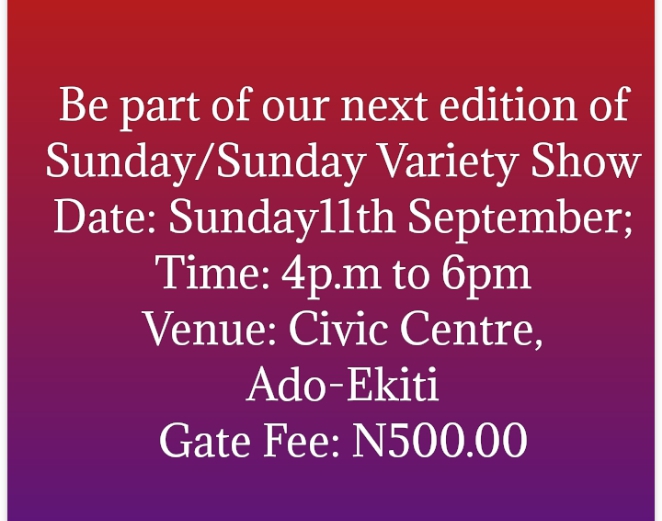 Sunday/Sunday Variety Show is a new initiative designed by Professor Rasaki Ojo Bakare. It was conceived as a means through which Ekiti people can recreate and relax with members of their family in a conducive and friendly atmosphere apart from clubs, parks and hotels. It also as platform for the exhibition and development of talents. This explains why the show is also tagged ‘ Talents on the Loose”.