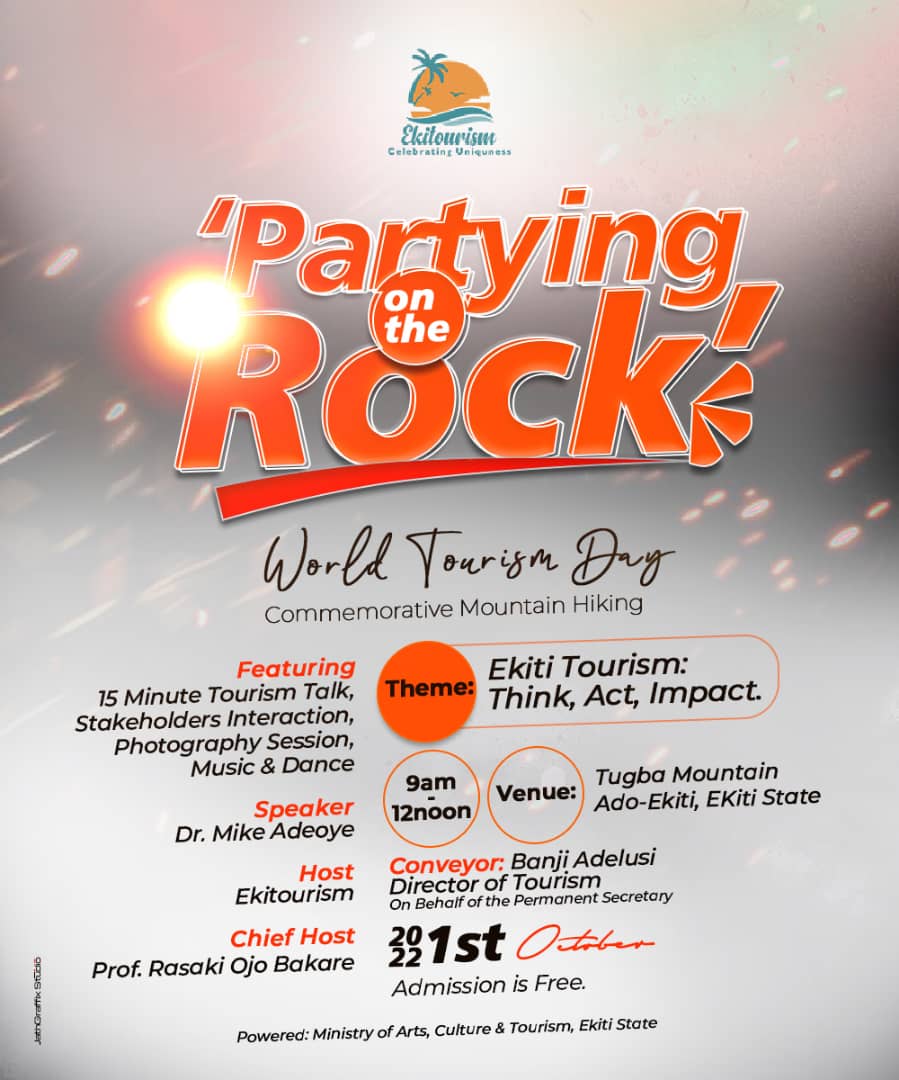 The Director of Tourism, Prince Adebanji Adelusi explained that the celebration of the World Tourism Day would hold on 1st October, 2022. This is to ensure that all operators of tourism are involved. He also gave insight into the activities lined up for the celebration which include a commemorative Mountain Hiking, photoshoot, a 15-minute lecture, dance and music. The event is tagged “Partying on the Rock” having scheduled it to be held on the plateau of the Tungba Crushed Mountain adjacent the Police State Headquarters, old Iyin Road, Ado-Ekiti. The event is to hold between 9a.m and 12 noon.